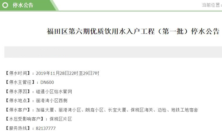 停水客戶:加福大廈、麗港灣小區(qū)、朗庭小區(qū)、長寶大廈、保稅區(qū)海關、邊檢、地鐵工地宿舍