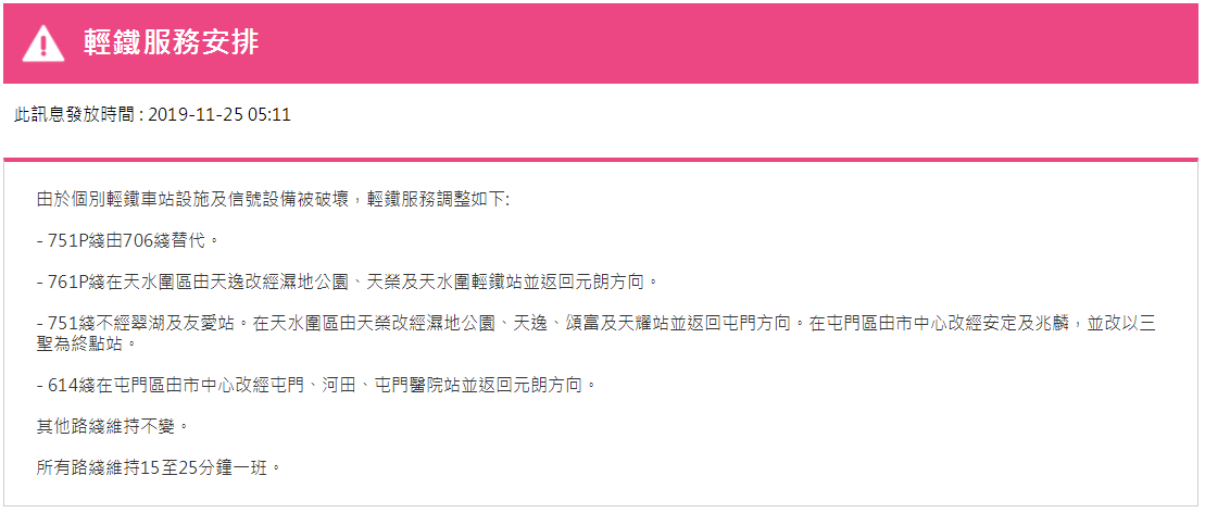據(jù)港鐵消息,11月25日,香港地鐵各線(機場快線除外)、輕鐵及港鐵巴士的服務將于晚上11時結束。紅磡站恢復列車服務,但只開放B、C出入口。大學站繼續(xù)關閉,列車不停大學站,個別車站出入口也會暫時關閉。