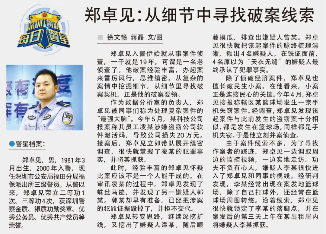 除了偵破經濟案件,鄭卓見也擅長破民生小案。在他看來,小案正是連接民心的關鍵。今年4月,鄭卓見接報稱轄區(qū)某籃球場發(fā)生一宗手機失竊案件。經調查,鄭卓見發(fā)現(xiàn)該起案件與此前發(fā)生的盜竊案十分相似,都是發(fā)生在籃球場,同樣都是手機失竊。于是他立刻并案偵查。