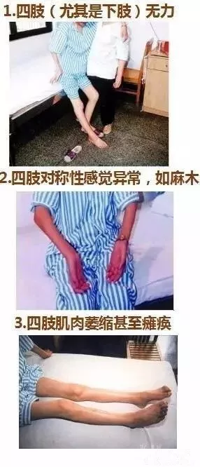 癥狀表現(xiàn)為肢體遠端麻木、疼痛、下肢沉重感,跟腱反射減弱或消失,四肢遠端肌肉明顯萎縮,影響運動功能。