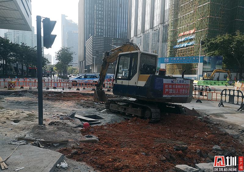 福田區(qū)福中三路和民田路的施工現(xiàn)場,道路被挖,一輛挖掘機(jī)停在道路上。
