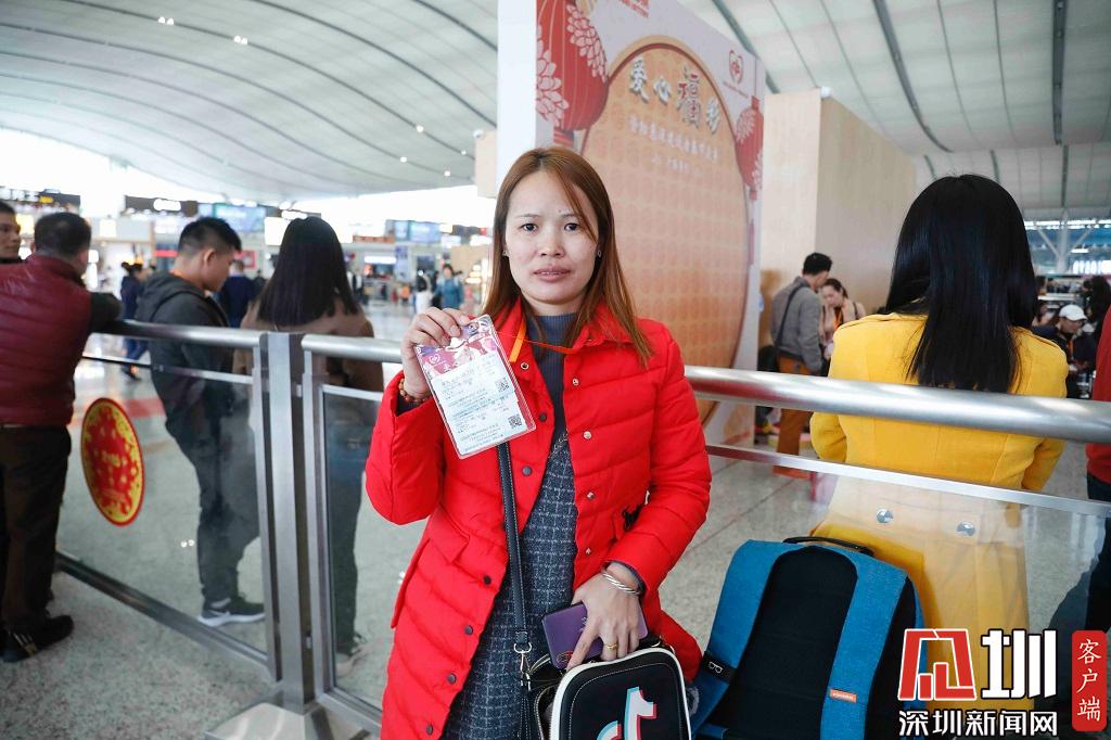 一位廣西來深建設(shè)者向鏡頭展示她的車票。