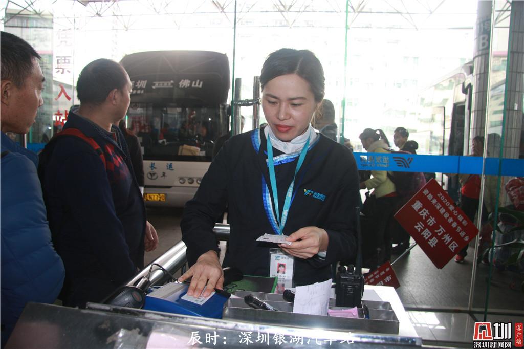 辰時:上午8點55分,銀湖汽車站檢票員吳偉燕正在對返鄉(xiāng)旅客進行檢票。