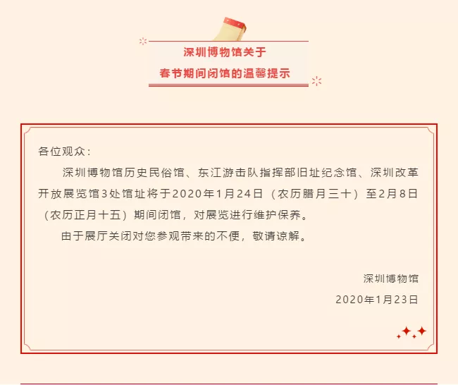 深圳博物館歷史民俗館、東江游擊隊(duì)指揮部舊址紀(jì)念館、深圳改革開放展覽館3處館址將于2020年1月24日(農(nóng)歷臘月三十)至2月8日(農(nóng)歷正月十五)期間閉館,對(duì)展覽進(jìn)行維護(hù)保養(yǎng)。由于展廳關(guān)閉對(duì)您參觀帶來的不便,敬請(qǐng)諒解。