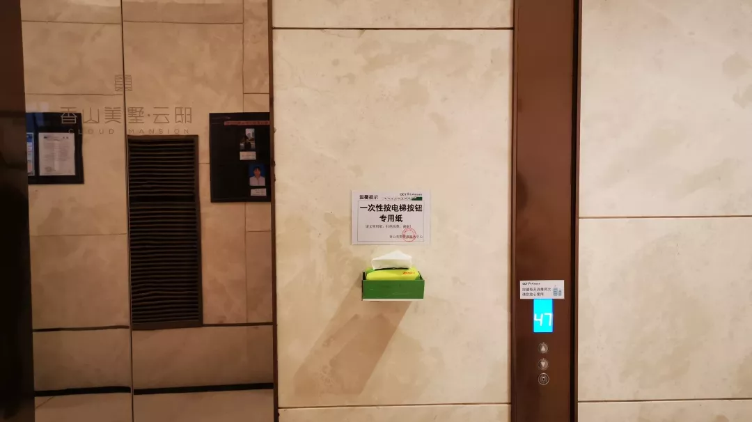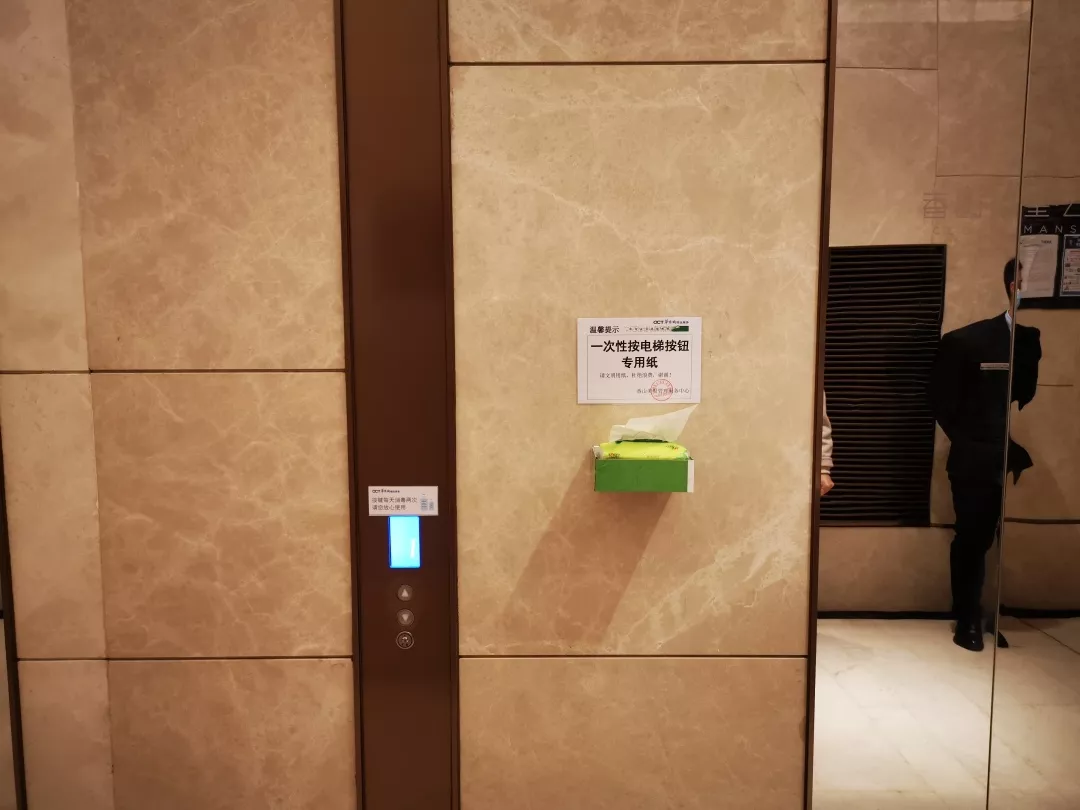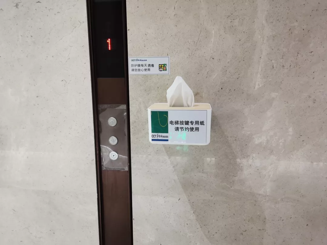 考慮到防控形勢需要,中心對電梯間及按鈕每天至少不低于2次消毒、且每天更換保鮮貼膜外,又于31日在各個電梯廳增設了一次性抽紙,供乘坐電梯按電梯按鈕時取用。(注:部分樓棟、明天陸續(xù)增設到位)