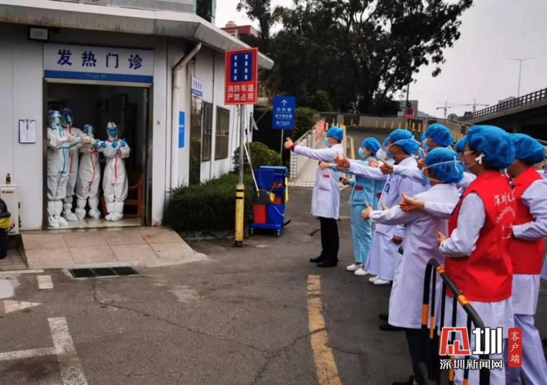 大年初一早上九點(diǎn),深圳市第二人民醫(yī)院發(fā)熱門診門口,院長(zhǎng)正在帶隊(duì)慰問(wèn)在發(fā)熱門診一線“戰(zhàn)疫”的工作人員,因?yàn)樘幱诿舾胁^(qū),發(fā)熱門診的工作人員只能這樣全幅武裝地表達(dá)決心。