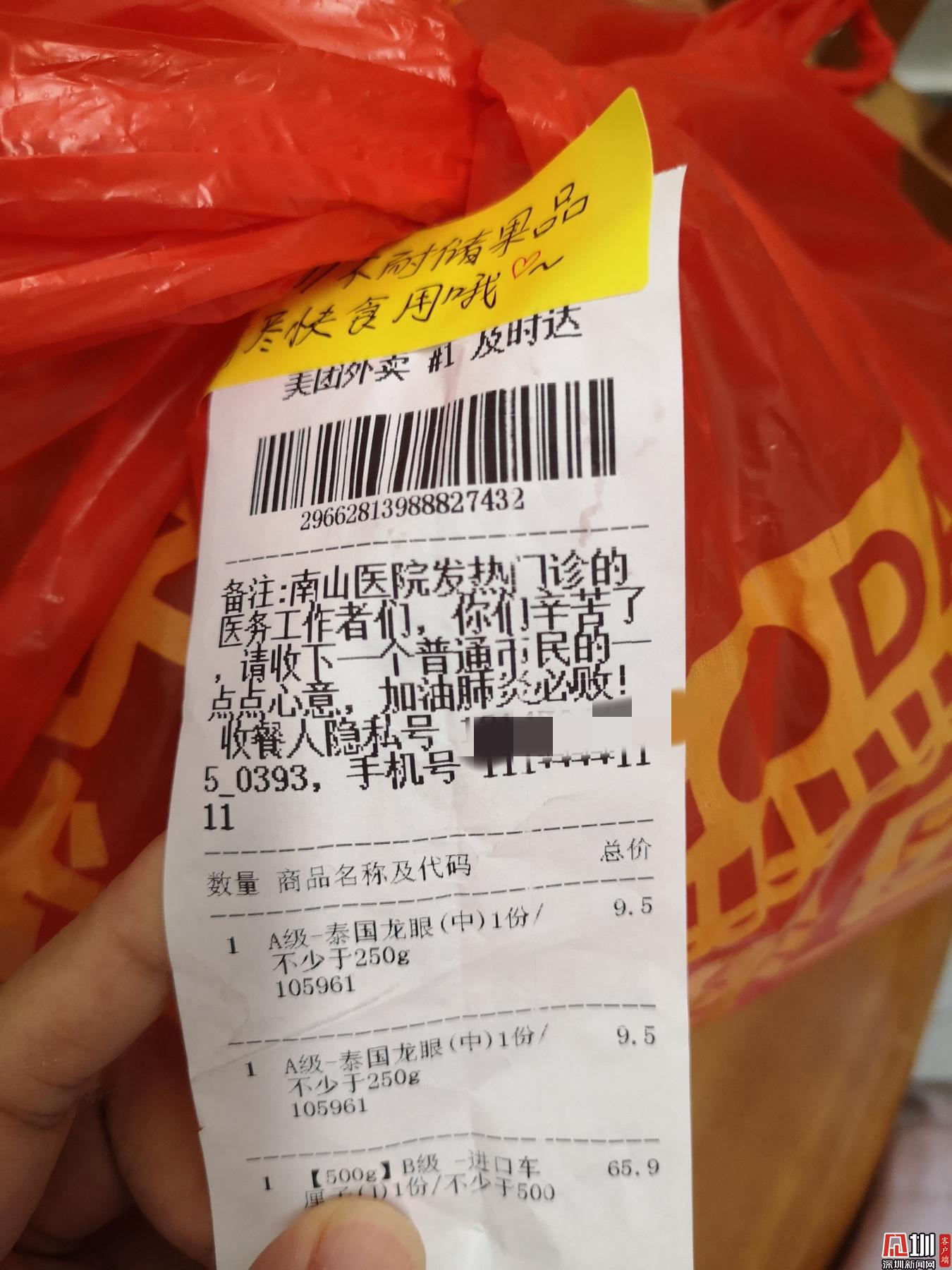見圳客戶端·深圳新聞網(wǎng)2020年2月1日訊 (見圳客戶端、深圳新聞網(wǎng)記者 劉夢婷 通訊員 深協(xié)和)“老淚縱橫!”1月30日晚上8點56分,華中科技大學協(xié)和深圳醫(yī)院(南山醫(yī)院)手外科護士王敏在朋友圈曬了一張照片,瞬時網(wǎng)友們紛紛點贊。照片里是一個紅色塑料袋上貼著一張外賣單,備注上寫著,“南山醫(yī)院發(fā)熱門診的醫(yī)務工作者們,你們辛苦了!請收下一個普通市民的一點點心意,加油,肺炎必敗!”