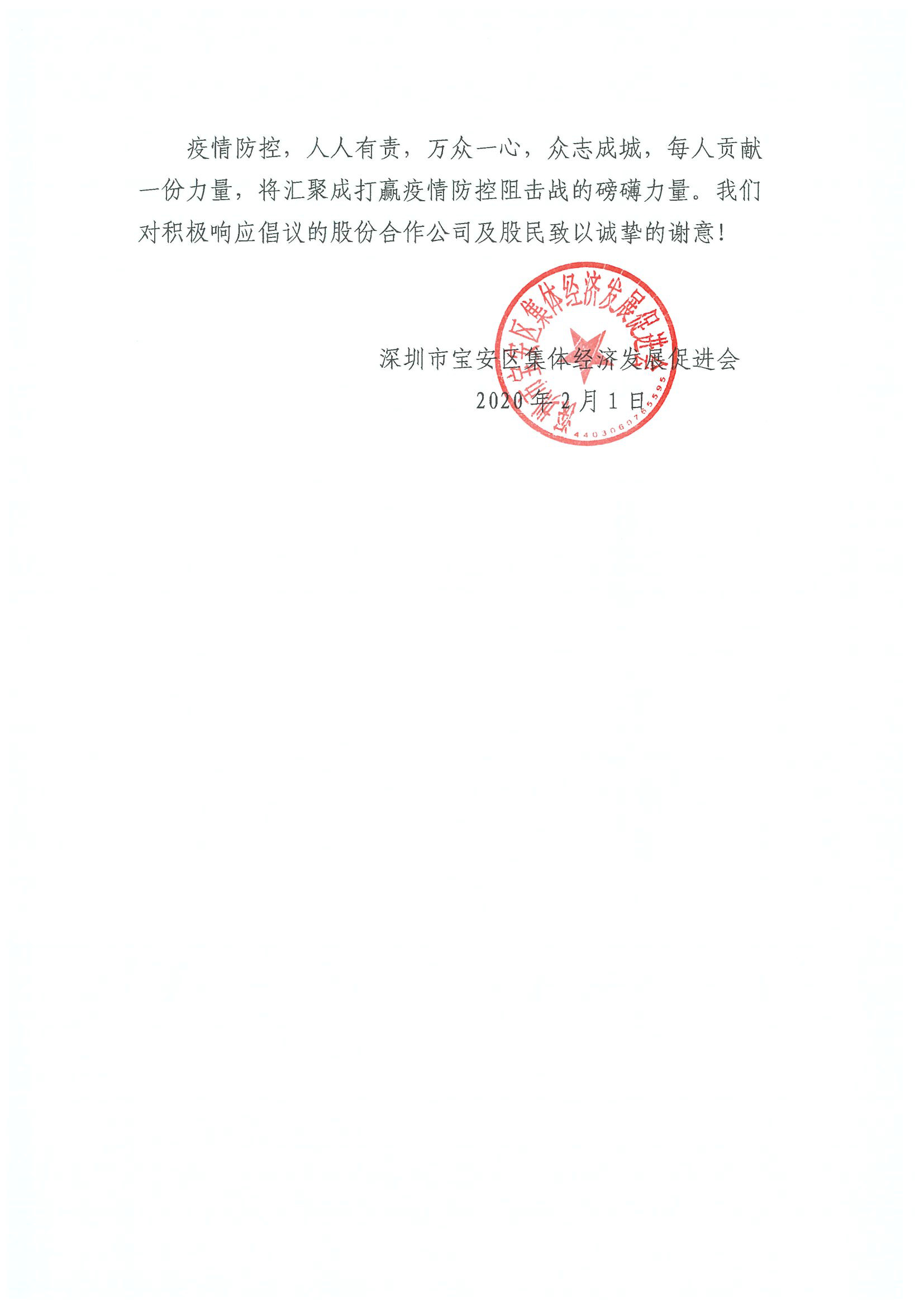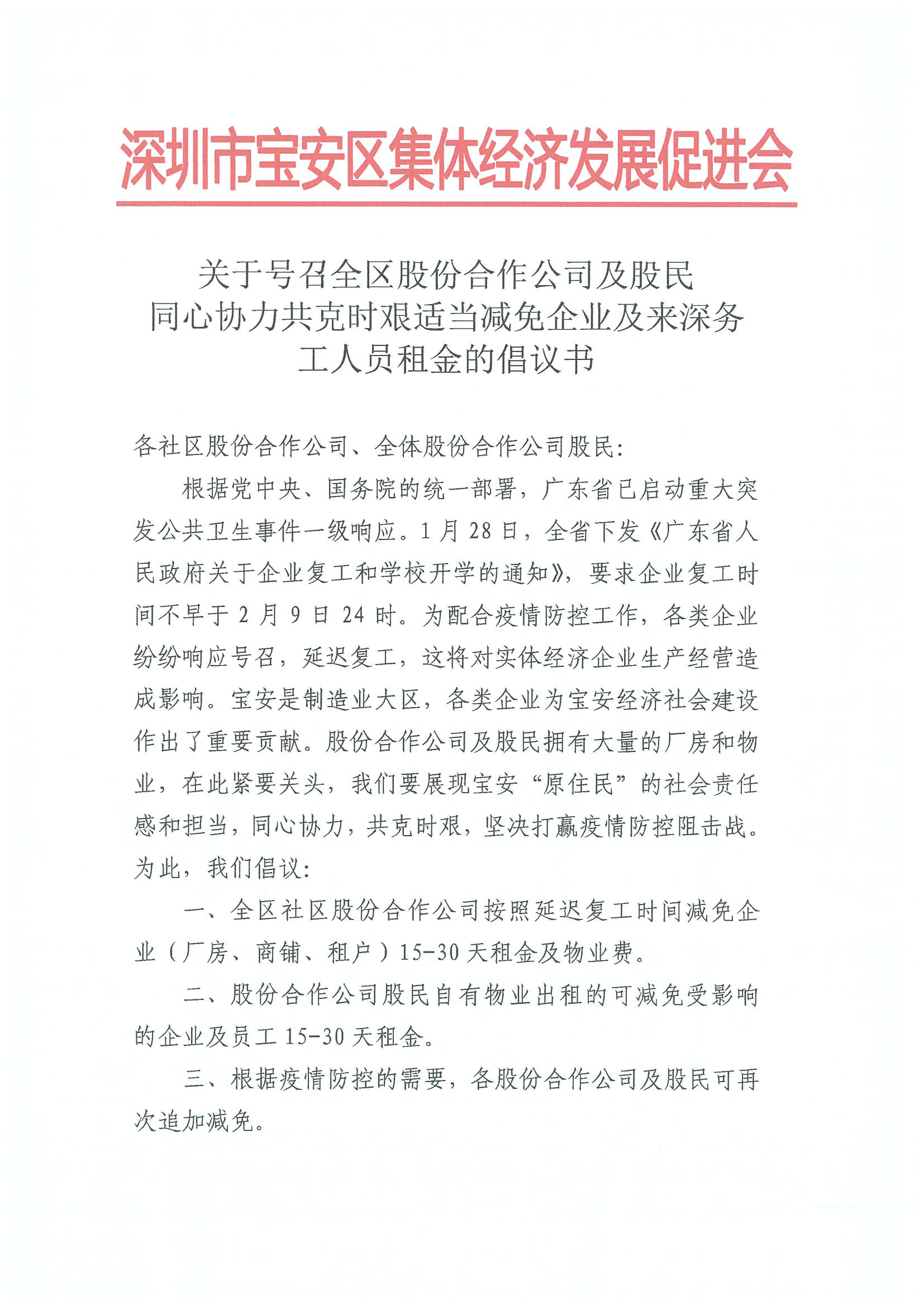 2月1日晚,寶安區(qū)集體資產(chǎn)管理局指導(dǎo)寶安區(qū)集體經(jīng)濟(jì)發(fā)展促進(jìn)會向?qū)毎矃^(qū)各社區(qū)股份合作公司、全體股份合作公司股民發(fā)出《同心協(xié)力共克時艱適當(dāng)減免企業(yè)及來深務(wù)工人員租金的倡議書》