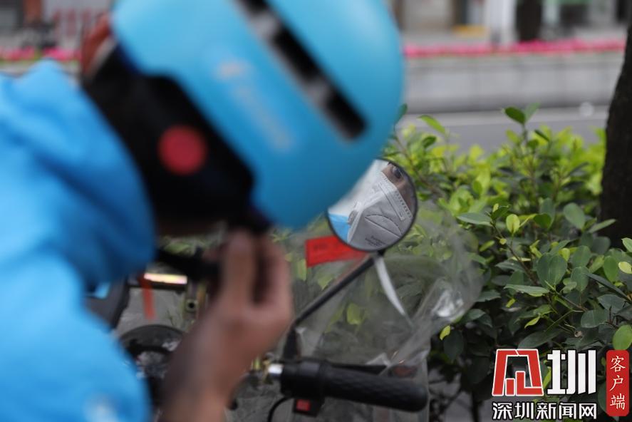 下午2點32分,午休過后,王彭輝用后視鏡調(diào)整戴好的頭盔,繼續(xù)送餐。