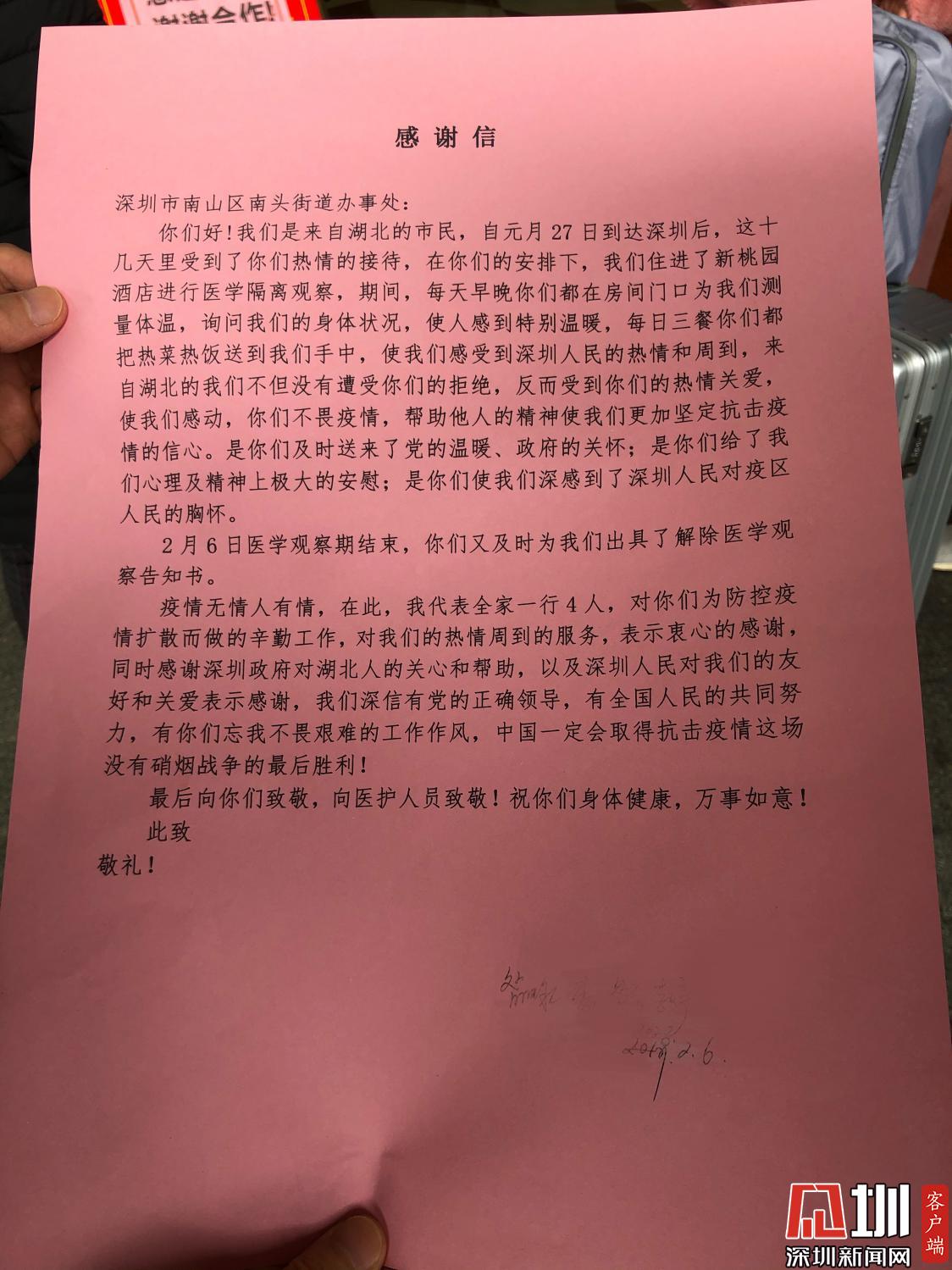 2月6日醫(yī)學觀察期滿,經(jīng)檢測他們一家并無不適癥狀,衛(wèi)健局駐點人員為其出具了解除醫(yī)學觀察告知書。李女士拉著行李滿眼淚花說道:“深圳各級政府部門高效實干,深圳的工作人員很熱心很細心,疫情猖獗時,人間自有真情在,真的感謝你們?!?/span>
