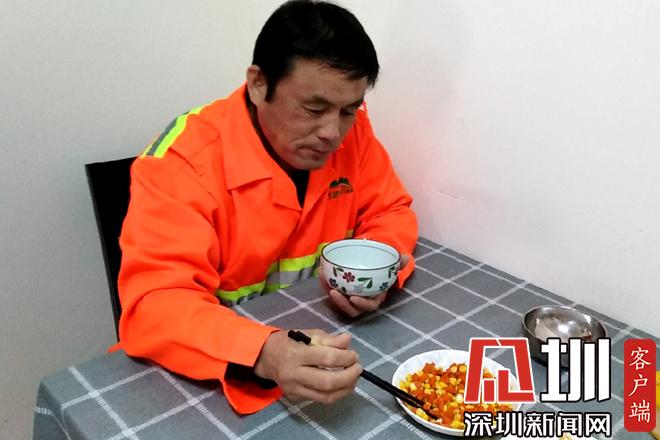 胡蘿卜丁炒玉米,再加一碟土豆絲下飯,這就是黃學志的午餐。黃學志說,他有幾年沒回老家了,本來計劃春節(jié)回去過年,順便帶老伴看病,沒想到疫情越來越嚴重,于是就打消了這個念頭。疫情發(fā)生以來,除了日常工作,他還要負責為值班同事普及疫情防控知識的任務。從早上7點半到12點半,下午1點半到5點半,他每天在沙頭角7個垃圾轉運站、18個公廁來回奔走,給同事配送口罩及消毒用品,檢查他們的身體健康情況。“現(xiàn)在是疫情防控關鍵期,我們也希望為防控工作貢獻出來自環(huán)衛(wèi)清潔行業(yè)的一份力量?!秉S學志說。(見圳客戶端、深圳新聞網記者鄧雪婷)