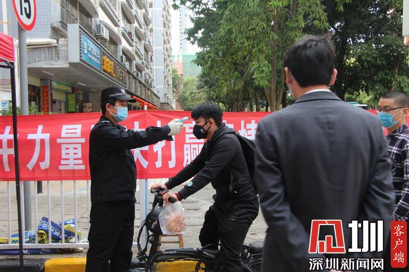 福田梅山苑保安正為一名進入小區(qū)的住戶測量體溫。
