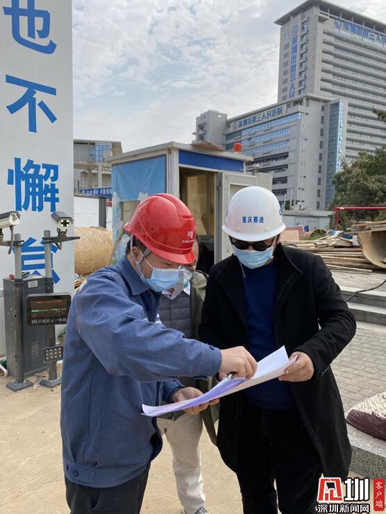 龍海波(左一)在“深圳版火神山”——市第三人民醫(yī)院二期工程臨時院區(qū)項目現(xiàn)場勘察供電線路。(蕭新敏 攝)