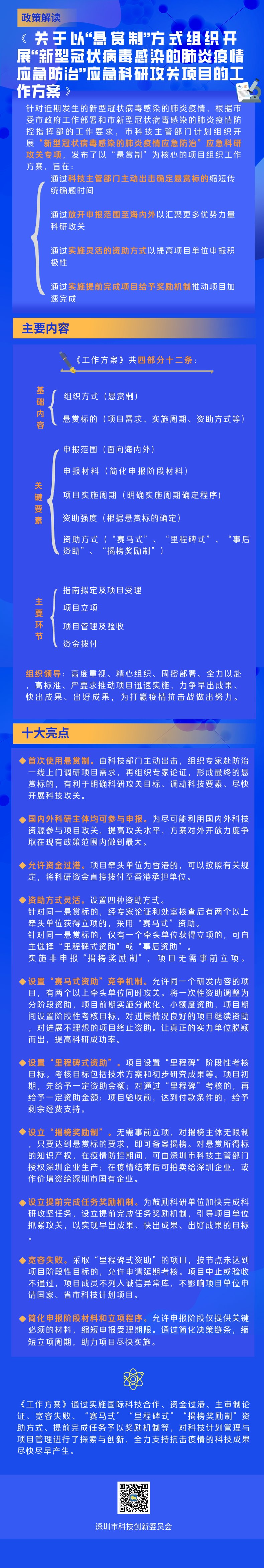 據(jù)悉,該方案首次使用懸賞制,由科技部門主動(dòng)出擊,組織專家赴防治一線上門調(diào)研項(xiàng)目需求,再組織專家論證,形成最終懸賞標(biāo)的。深圳市科創(chuàng)委相關(guān)負(fù)責(zé)人表示,以“懸賞”為方案核心有利于明確科研攻關(guān)目標(biāo)、調(diào)動(dòng)科技要素、盡快開展科技攻關(guān)。此外,為盡可能利用國內(nèi)外科技資源參與項(xiàng)目攻關(guān),提高攻關(guān)水平,方案對外開放力度爭取在現(xiàn)有政策范圍內(nèi)做到最大,國內(nèi)外科研主體均可參與申報(bào)。