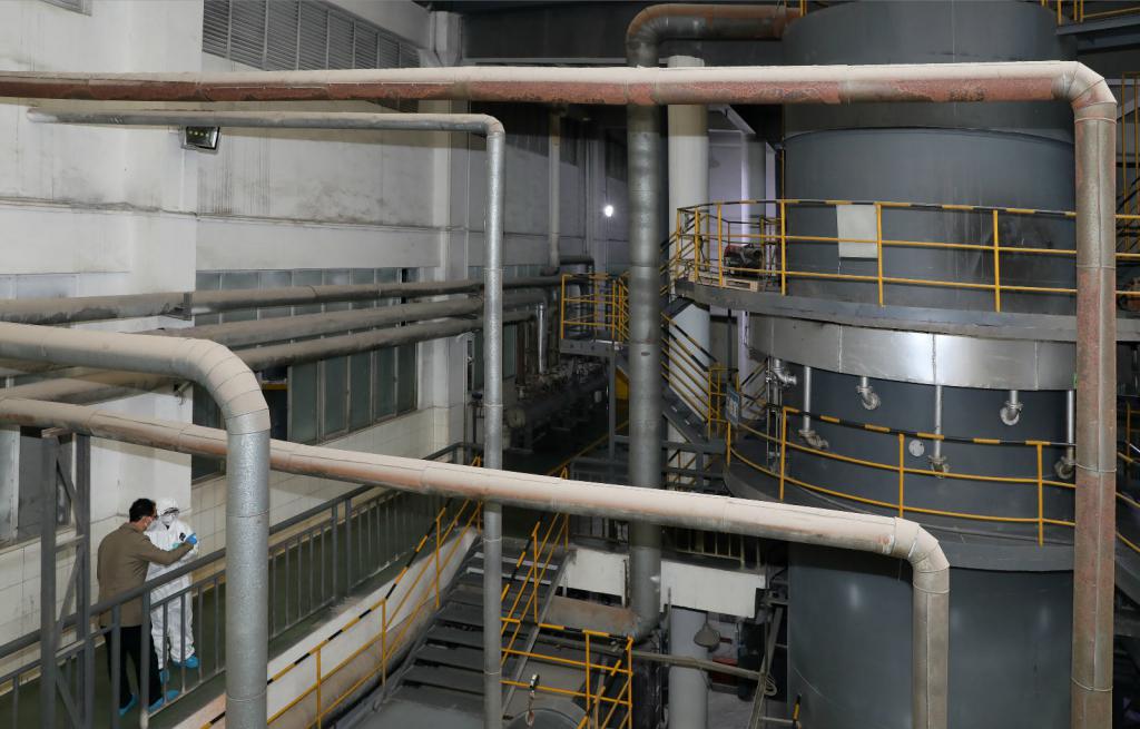 焚燒車間內,矗立著兩座高達十余米的熱解焚燒爐。焚燒爐中的溫度高達1000°C以上,正在焚燒包括新型冠狀病毒在內的多種醫(yī)療廢物。