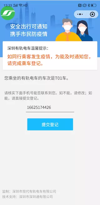 第一步:乘客使用微信掃描列車車廂內(nèi)的登記碼,登記頁面會自動顯示上次登記的手機號或在“深圳通+”小程序中注冊的手機號碼: