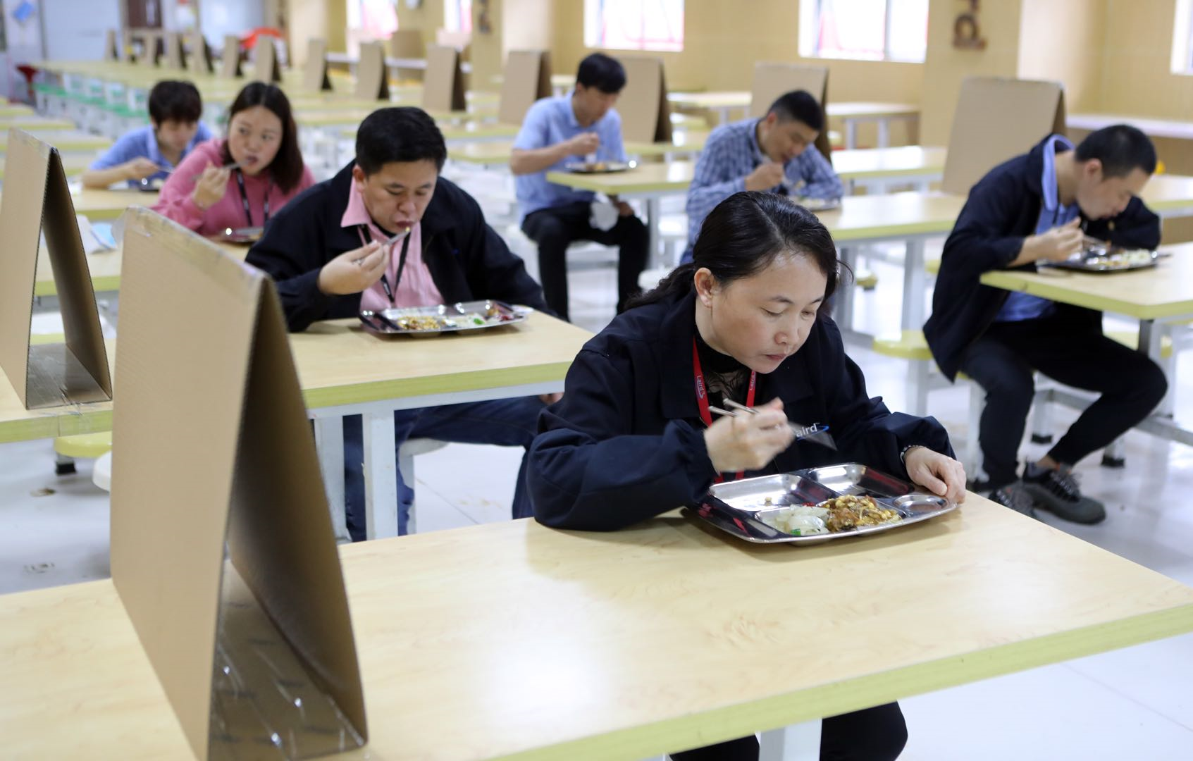這樣的座位安排方式和擋板在員工食堂同樣可以看到。不同的是,就餐員工被嚴(yán)格分流,采取多時段少人次的方式分時段分批就餐。