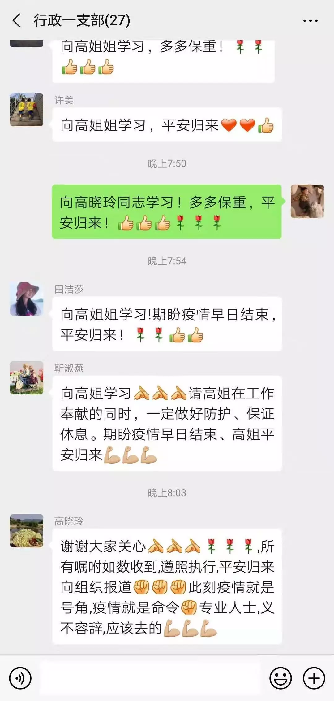 晚上,在黨支部的微信群里,作為支部委員的高曉玲向組織堅定承諾:“此刻疫情就是號角,疫情就是命令,專業(yè)人士,義不容辭,應(yīng)該去的!”