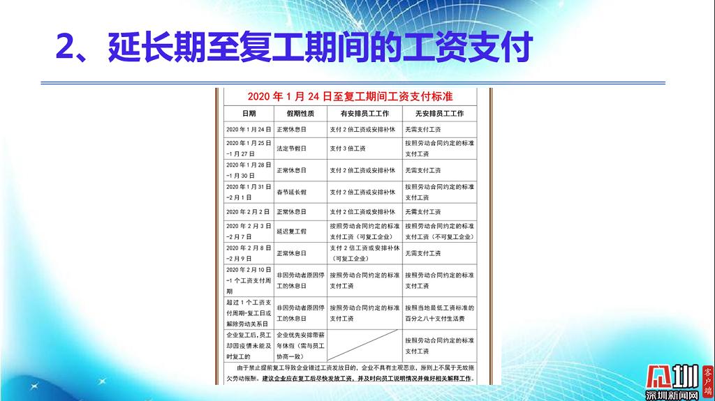 延長期至復(fù)工期間的工資支付問題。延期提前開工,足額支付、加班雙倍;延期正常開工,遵循法規(guī)、正常出勤;開工停工停業(yè),首月按照勞動合同規(guī)定正常支付,次月遵法即可;在家網(wǎng)上開工,工資照常應(yīng)照常發(fā)放;開工不足機(jī)制,輪崗待崗、假期協(xié)商;遵守當(dāng)?shù)胤ㄒ?guī),因地制宜,和諧有道。