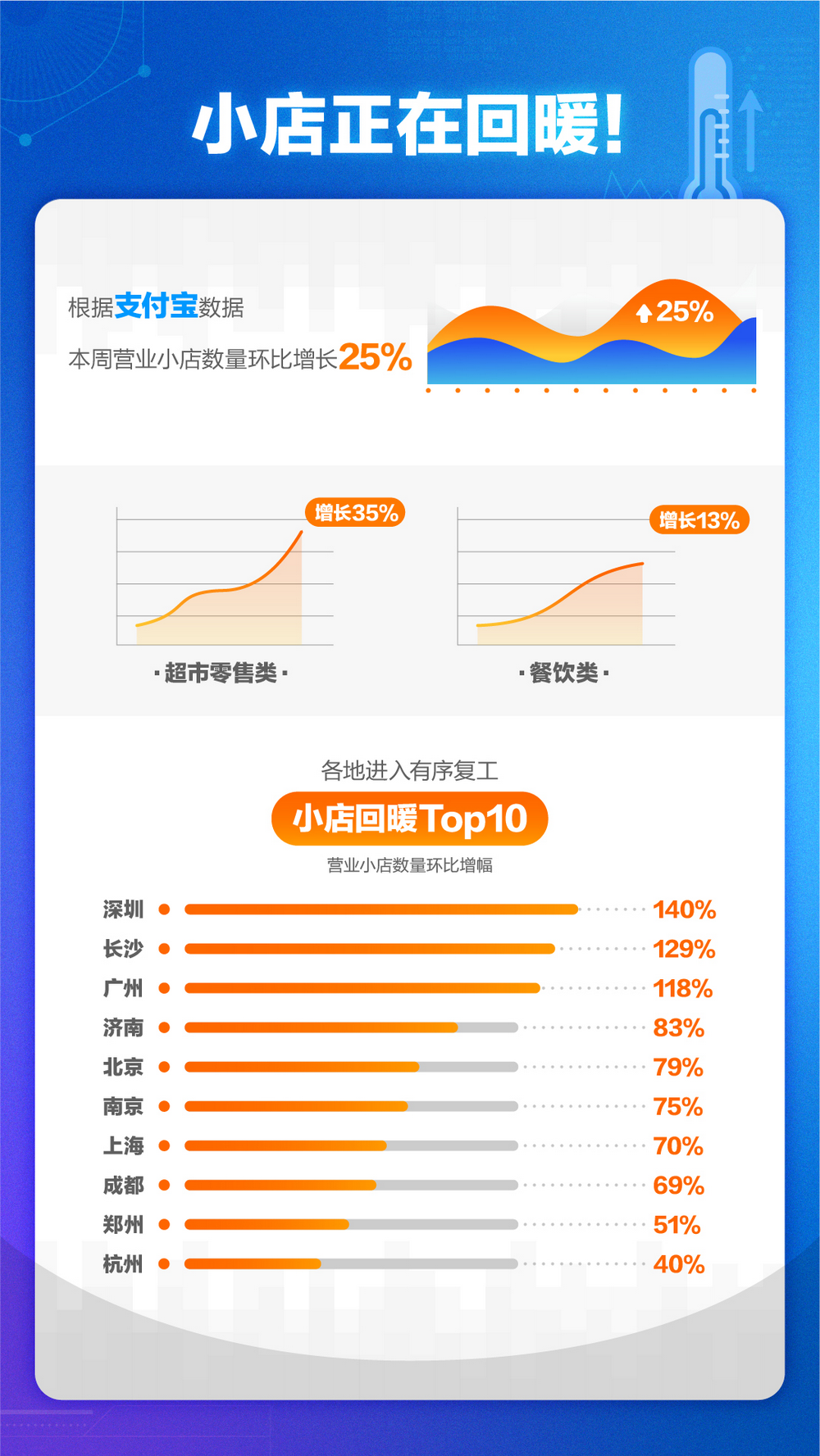 見圳客戶端·深圳新聞網2020年2月19日訊(見圳客戶端、深圳新聞網記者 陳婕)本周全國迎來新一輪復工潮,來自支付寶的最新數(shù)據顯示:本周營業(yè)小店數(shù)量環(huán)比增長25%,與百姓生活關聯(lián)度緊密的超市零售類小店,增幅達到35%。其中,深圳、長沙、廣州的增幅最大,位列前三。