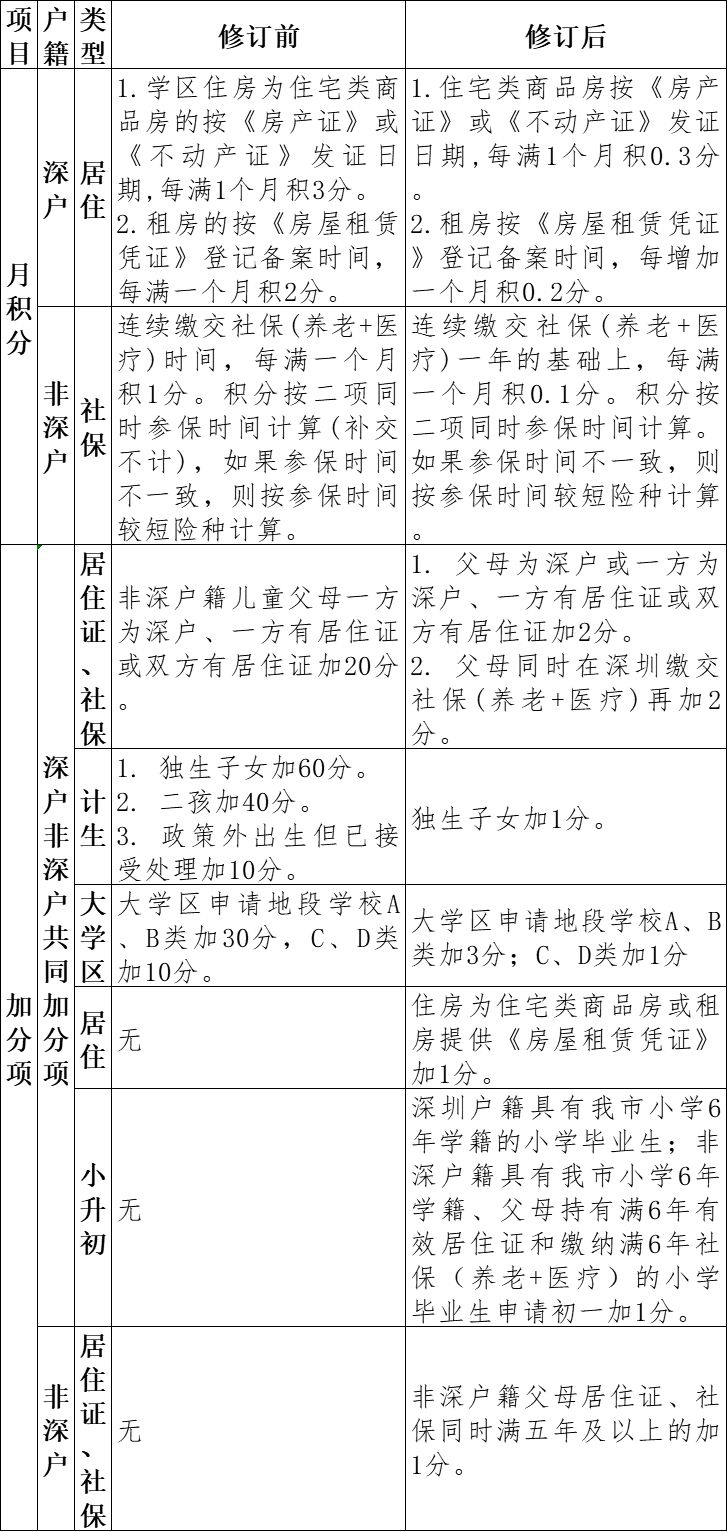 (3)非深圳戶籍兒童父母為深圳戶籍或雙方有居住證或一方有居住證另一方為深圳戶籍由原來加20分調整為2分;同時,加分對象由非深戶調整為所有申請兒童。