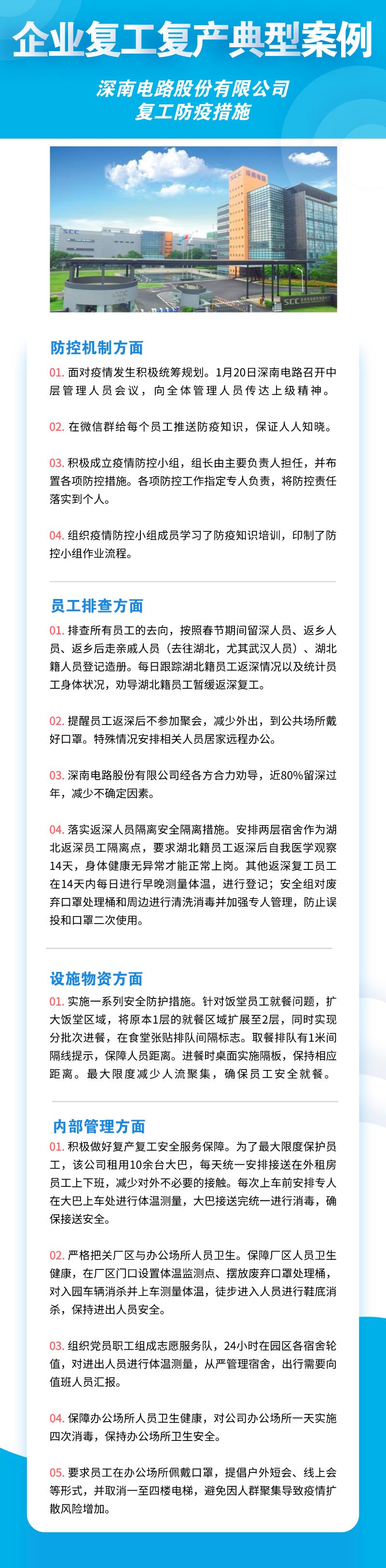 深圳市華為技術(shù)有限公司、聯(lián)想系統(tǒng)集成(深圳)有限公司、深南電路股份有限公司、比亞迪股份有限公司、創(chuàng)維集團股份有限公司等8家公司,從防控機制、員工排查、設(shè)施物資、內(nèi)部管理四個方面來落實疫情防控措施,包括成立企業(yè)疫情防控小組、建立企業(yè)防控機制、提升員工防控意識、劃分隔離區(qū)域、宿舍食堂等區(qū)域消殺等舉措。