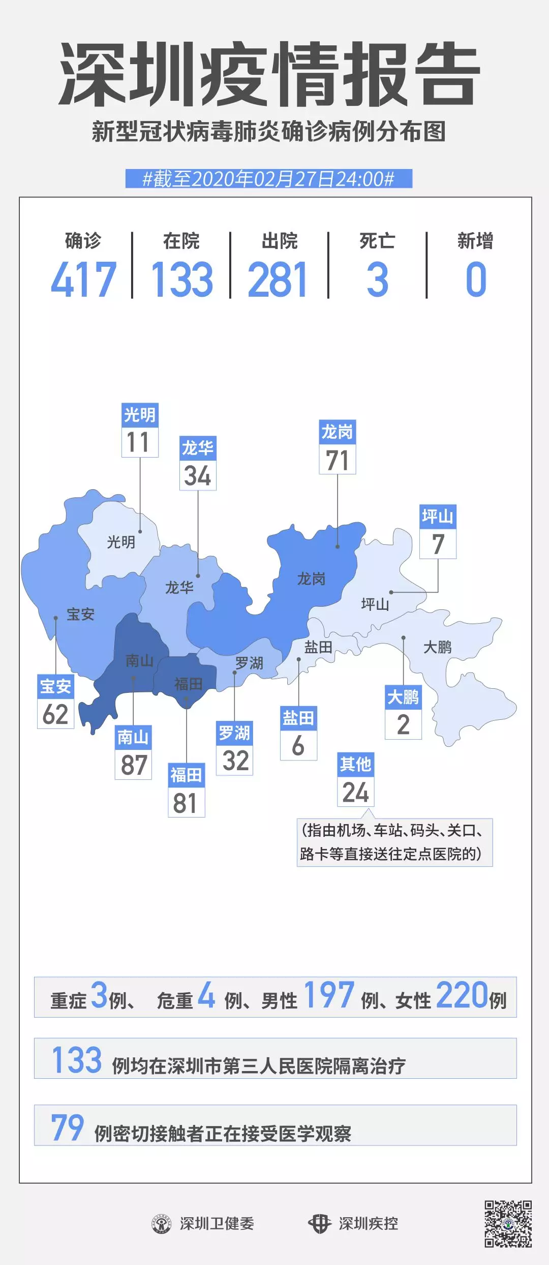 截至2月27日24時,深圳累計報告“新冠肺炎”確診病例417例。2月27日當天全市無新增確診病例,當天出院病例10例(從26日起不再公布出院個案)。