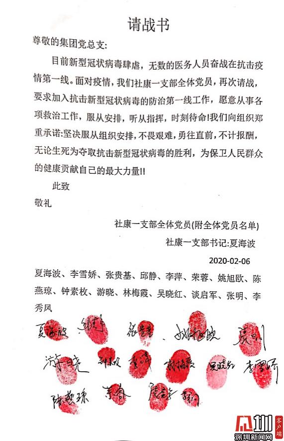 見圳客戶端·深圳新聞網(wǎng)訊(記者 董非)“讓黨旗在防控斗爭第一線高高飄揚?!毙鹿诜窝滓咔榘l(fā)生以來,南山區(qū)醫(yī)療集團總部黨員勇當(dāng)先鋒,以實際行動踐行初心使命,涌現(xiàn)出眾多感人故事,展現(xiàn)了共產(chǎn)黨員的風(fēng)采與擔(dān)當(dāng)。 疫情發(fā)生后,南山區(qū)第一時間制定出臺了《黨建引領(lǐng)疫情防控工作五項行動方案》,南山區(qū)委書記王強號召全體黨員,發(fā)揮黨組織的戰(zhàn)斗堡壘作用和黨員的先鋒模范作用,全力保障人民群眾生命安全和身體健康,讓黨旗在防控疫情斗爭第一線高高飄揚,堅決打贏疫情防控人民戰(zhàn)爭、總體戰(zhàn)、阻擊戰(zhàn)。南山區(qū)醫(yī)療集團總部積極響應(yīng),黨建引領(lǐng)下的防控抗疫工作有序科學(xué)地展開。 今年1月底,深圳市南山區(qū)區(qū)委授旗成立南山醫(yī)療系統(tǒng)黨員突擊隊。南山區(qū)醫(yī)療集團總部緊急組建了防控新冠肺炎應(yīng)急突擊隊,僅一天內(nèi)區(qū)醫(yī)療集團就共有169人完成第一批應(yīng)急突擊隊報名,其中黨員過半數(shù)。 疾風(fēng)知勁草,烈火煉真金。一封封請戰(zhàn)書閃電匯聚到黨總支,召即來,來能戰(zhàn),戰(zhàn)能勝,沖鋒在前就是擔(dān)當(dāng)?shù)淖蠲姥堇[;一位位黨員迅速入隊黨員突擊隊,他們重溫入黨誓言,在黨旗下實踐著醫(yī)者仁心、人間大愛;一份份入黨申請書紛沓而來,特殊時期經(jīng)受特殊考驗,一批優(yōu)秀的醫(yī)護人員頁主動向黨組織靠攏。鏗鏘的語言、堅定的決心、舍我的擔(dān)當(dāng),是南山區(qū)醫(yī)療集團總部廣大黨員逆行而上、抗擊疫情的堅定決心和必勝信心。 最美逆行黨支部,積極請戰(zhàn)敢擔(dān)當(dāng) “我是共產(chǎn)黨員,我請戰(zhàn)!愿為戰(zhàn)勝疫情全力以赴!”這是南山區(qū)醫(yī)療集團總部一支部13名黨員和2名入黨積極分子聯(lián)名撰寫的《請戰(zhàn)書》(節(jié)選)。 面對新冠肺炎疫情,一支部黨員在夏海波支部書記夏海波的帶領(lǐng)下,在發(fā)熱門診、發(fā)熱患者預(yù)檢分診、社區(qū)“三位一體”排查等工作中,積極發(fā)揮共產(chǎn)黨員戰(zhàn)斗在一線、沖鋒在一線的模范帶頭作用,為戰(zhàn)勝新冠肺炎疫情全體黨員積極主動請戰(zhàn),并向集團黨總支遞交了請戰(zhàn)書。 社康一支部全體黨員的請戰(zhàn)書 一個個紅手印,令人淚目,彰顯著南山區(qū)醫(yī)療集團總部白衣天使們逆行而上的使命擔(dān)當(dāng)和責(zé)任意識。 一支部書記夏海波說,“成為疫情防控工作第一線發(fā)展黨員,是面對疫情充分發(fā)揮黨員先鋒作用的具體實踐。此次請戰(zhàn),將更加激勵他們我們在今后的工作特別是近期防疫防控工作中,以黨員的標(biāo)準(zhǔn)嚴(yán)格要求自己,發(fā)揮黨員先鋒模范作用。同時,也會對全院全體員工產(chǎn)生積極引領(lǐng)、鼓舞作用,以更飽滿的斗志投入防疫防控工作?!?/p> 老黨員重溫入黨誓詞,面對黨旗表決心 “我宣誓:我志愿加入中國共產(chǎn)黨……”這是一次特別的宣誓。接到組織號召后,社康二支部的老黨員鐘達宏和吳麗娉,對著黨旗,以重溫入黨誓詞的方式,不忘黨員初心,牢記使命,積極沖鋒在前,誓要打贏防控狙擊戰(zhàn)。 社康二支部的老黨員鐘達宏和吳麗娉,對著黨旗,重溫入黨誓詞,誓要打贏防控狙擊戰(zhàn) 面對來勢洶洶的疫情,南山區(qū)醫(yī)療集團總部的黨組織和黨員干部不但沒有被嚇倒,反而激起了他們昂揚的戰(zhàn)斗意志和飽滿的工作熱情。 “我宣誓,我自愿加入抗擊新型冠狀病毒肺炎疫情防控工作隊伍,責(zé)任上肩,聽黨指揮,服從命令,科學(xué)應(yīng)對,恪盡職守,努力守護轄區(qū)居民健康,堅決打贏疫情防控攻堅戰(zhàn)!”守土有責(zé)、守土擔(dān)責(zé)、守土盡責(zé),所有社康中心的黨員干部將筑牢抗疫的基層防線,誓要守護轄區(qū)居民的生命健康。 社康二支部黨員在黨旗下宣誓努力守護轄區(qū)居民健康 艱難時刻主動請戰(zhàn),夫妻雙雙奮戰(zhàn)一線 1月26日,南山區(qū)醫(yī)療集團總部下發(fā)關(guān)于組建防控新型冠狀病毒感染肺炎應(yīng)急突擊隊報名的通知。除了得到集團黨員們的積極響應(yīng)之外,各個支部涌現(xiàn)出一波遞交入黨申請書的小高潮。 李婧是社康支部的一名全科醫(yī)生,一直在社康醫(yī)院中心從事全科醫(yī)療工作,戰(zhàn)“疫”的號角吹響,李婧第一時間參戰(zhàn),在所有抗疫時期入黨人員里第一個遞交了手寫入黨申請書。 李婧醫(yī)生的手寫入黨申請書 起初,她所在的蔚藍(lán)海岸社康中心考慮到李婧的愛人是深圳市公立醫(yī)院急診科醫(yī)生其愛人是深圳市某公立醫(yī)院的急診科醫(yī)生,疫情發(fā)生以來一直堅守在崗位上,家中尚有1歲零3個月的寶寶,就沒有讓她參加社區(qū)“三位一體”排查和酒店留守值班等一線工作和醫(yī)學(xué)觀察點留守值班等一線工作。李婧得知后,她主動提交請戰(zhàn)書、舍小家顧大家,并沒有因為生活上的困難而有所退縮,主動要求參與疫情排查一線工作。李婧夫妻還制定了家庭的“交接班”制度,一個去上白班,另一個就上夜班。 執(zhí)行三位一體排查工作前,李婧醫(yī)生與民警、社區(qū)工作者開會準(zhǔn)備 在南山醫(yī)療集團第六黨支部書記蔡偉山給她的入黨介紹信中這樣寫道:李婧和她的愛人