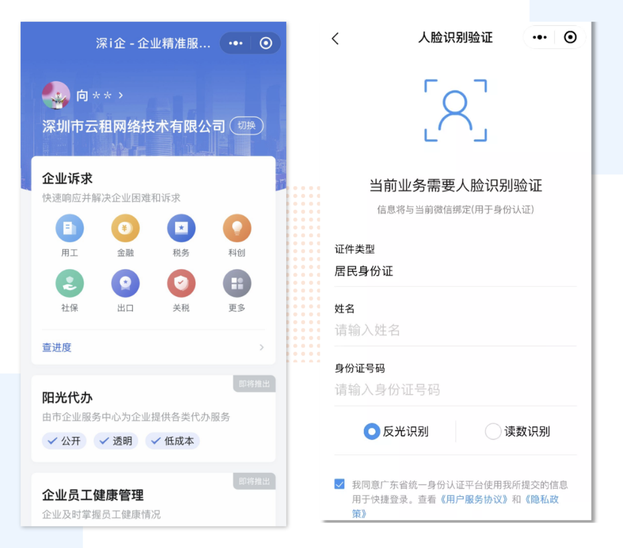 企業(yè)法人或經(jīng)辦人進(jìn)入“深i企-精準(zhǔn)服務(wù)服務(wù)”平臺,選擇登錄,進(jìn)入實(shí)名認(rèn)證環(huán)節(jié)。輸入姓名和證件號碼后,通過人臉識別即可完成實(shí)名認(rèn)證。