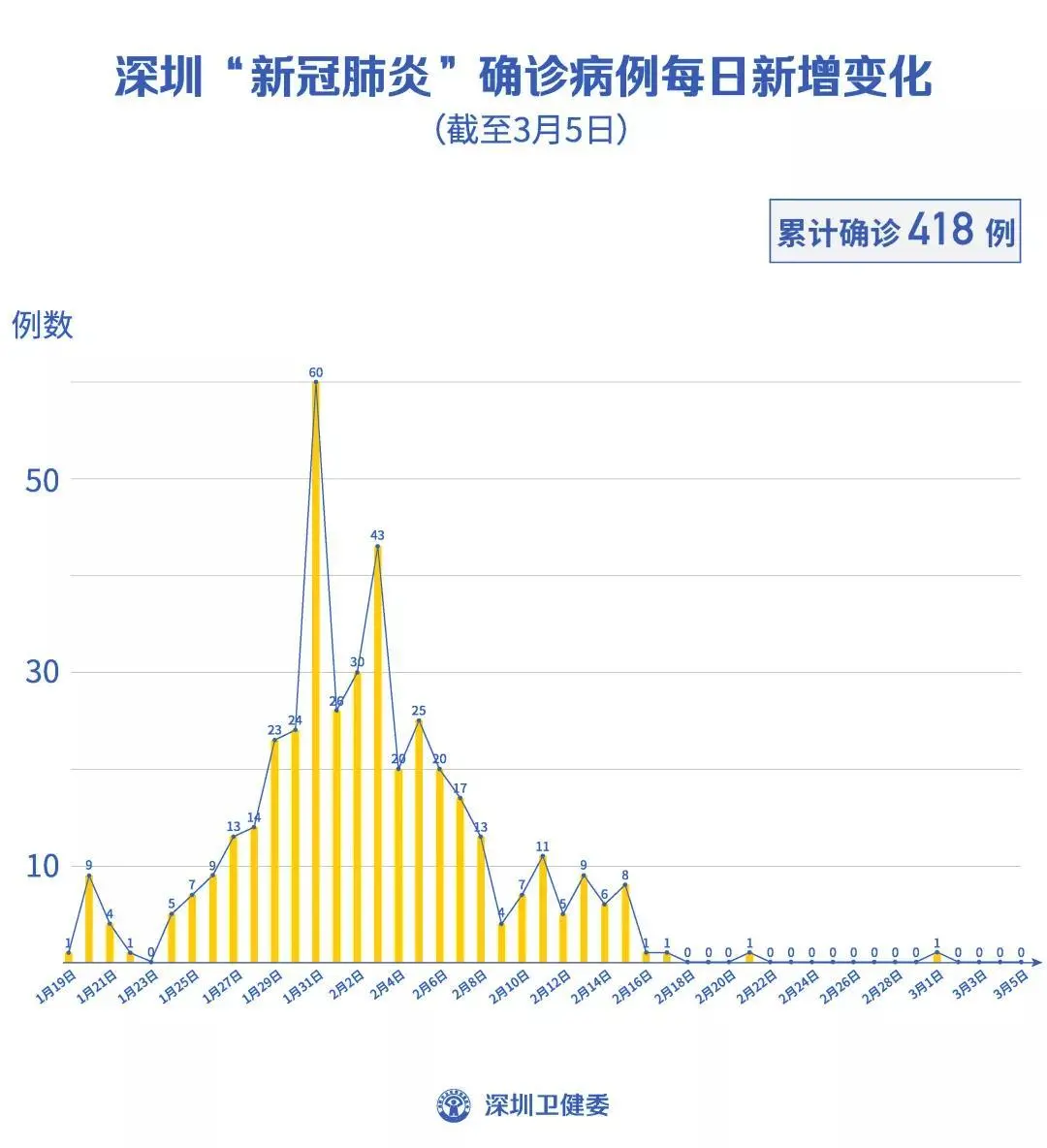截至3月5日24時,深圳累計報告“新冠肺炎”確診病例418例。3月5日當天全市無新增確診病例,當天出院病例8例(從2月26日起不再公布出院個案)。