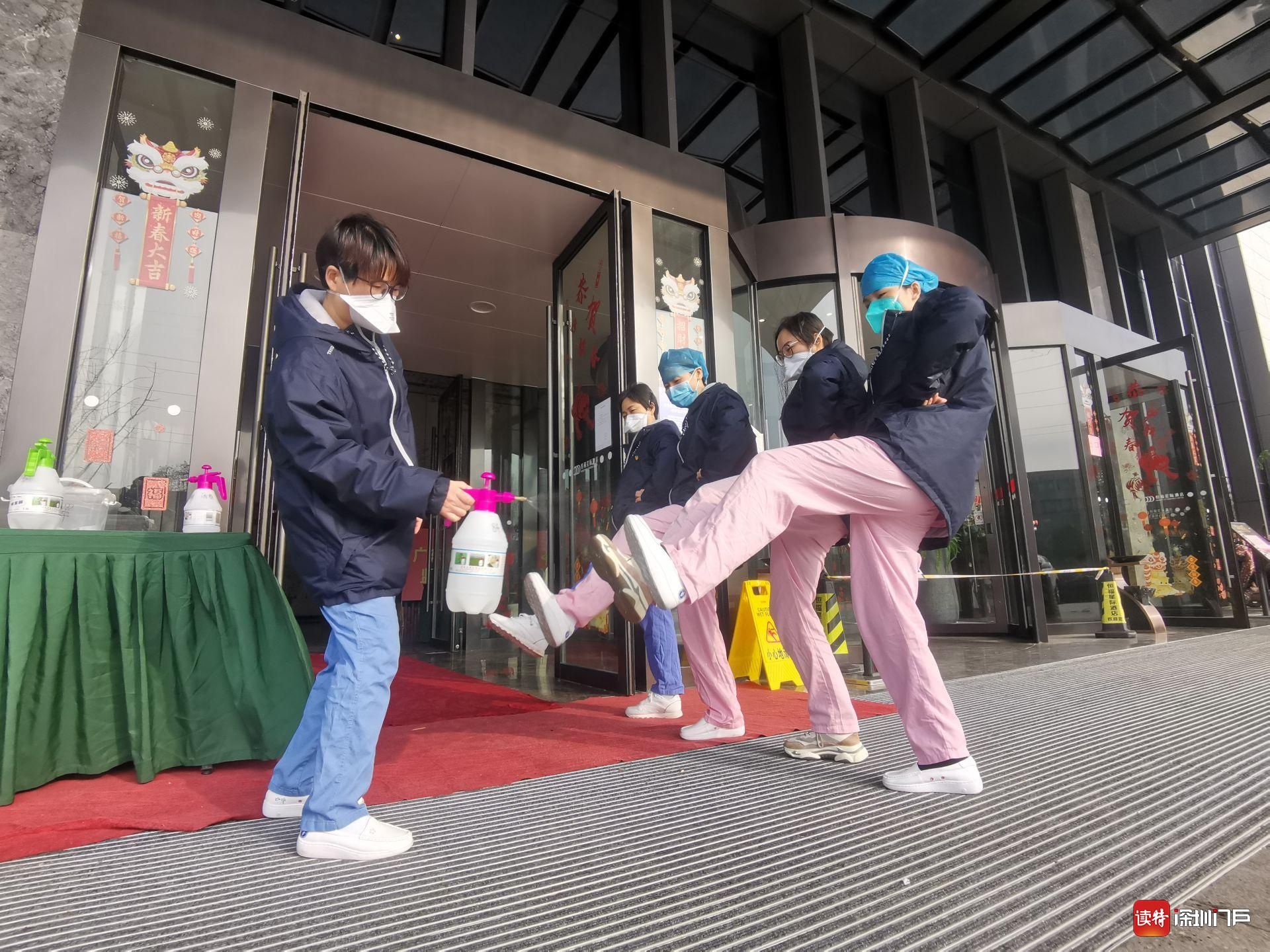 進(jìn)入駐地酒店前,深圳醫(yī)療隊(duì)隊(duì)員列隊(duì)用酒精進(jìn)行鞋底消毒