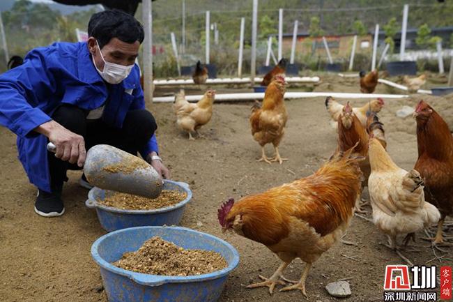 3月11日的清晨,66歲的王子平頂著薄霧,在田西村百香雞孵化養(yǎng)殖基地中,撒下了喂養(yǎng)雞群的百香果玉米等混合飼料。這些雞,已經(jīng)在田西村山坡上散養(yǎng)了超過240天,也就是扶貧產(chǎn)業(yè)農(nóng)產(chǎn)品“百香雞”。這是深圳南山對口扶貧連平縣百香雞孵化養(yǎng)殖基地的一個勞作場景。