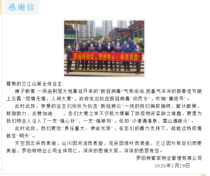 云頂尚品小區(qū)業(yè)主為了感謝物業(yè)在疫情防控期間堅(jiān)守崗位,也自發(fā)組織捐款21250元為物業(yè)單位員工獻(xiàn)愛心,并送上寫著“疫情無情人有情,用心服務(wù)暖人心”的錦旗。