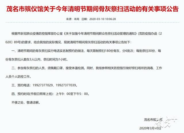茂名市殯儀館提供限制性祭掃服務(wù),清明節(jié)期間的骨灰祭掃實(shí)行電話實(shí)名制預(yù)約,每天限制祭掃180份骨灰,分6批次;每批祭掃30份,每份骨灰祭掃人數(shù)在3人以內(nèi),祭掃時(shí)間為1小時(shí)。
