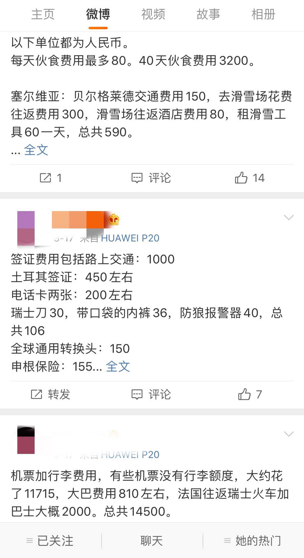 當(dāng)事人在微博上公布的旅行費用