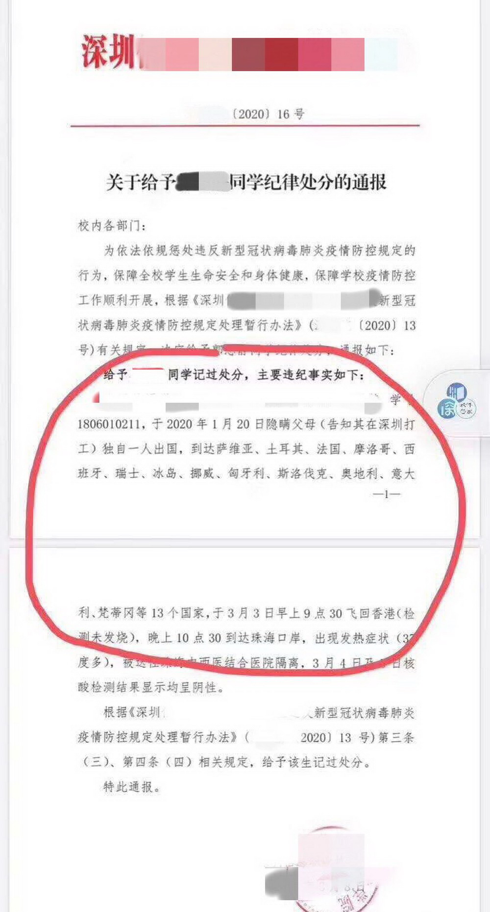記者從小Y處了解到,1月20日,她出發(fā)開始旅行并于3月3日從珠海入境回國,期間共游玩13個國家?!?0月份就已經(jīng)決定出去玩,11月一直在準(zhǔn)備簽證,12月中旬簽證什么的都已經(jīng)準(zhǔn)備好了?!庇捎诤ε赂改笓?dān)心她一人在外旅行的安全問題,出發(fā)時并沒有告知父母?!?月23日,學(xué)校要求所有學(xué)生填寫一個假期所在地,我填寫的是‘在家’,因為不想讓家里人知道我在國外,害怕穿幫。出發(fā)時國內(nèi)疫情還沒有爆發(fā),所以不是很清楚國內(nèi)的疫情,也沒想到填這個信息是為了防控疫情所用,所以沒有如實填寫。大年初一,也就是1月24日,我父母知道了我出國的事,對我嚴(yán)厲批評。之后學(xué)校要求填寫表格,我沒有隱瞞,都是如實填寫?!?/p>