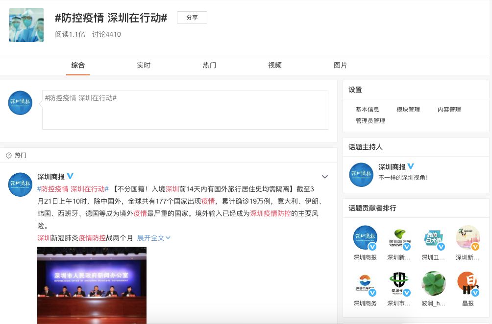 疫情發(fā)生初期,深圳商報(bào)微博創(chuàng)建話題 #防控疫情 深圳在行動(dòng)# ,以高度的責(zé)任感和使命感全方位加強(qiáng)宣傳報(bào)道和輿論引導(dǎo),疫情相關(guān)信息均帶話題發(fā)布,人們可以系統(tǒng)地查看疫情相關(guān)信息。