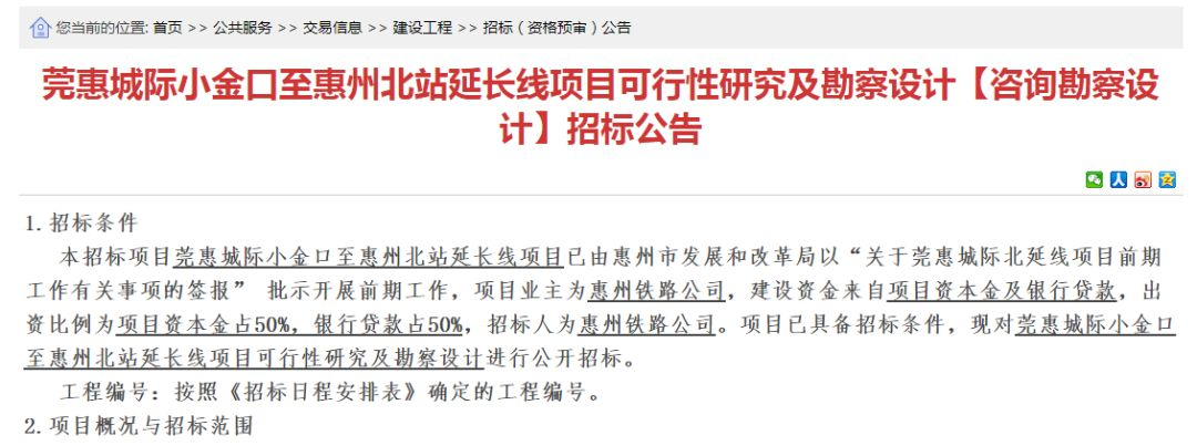 公告顯示,莞惠城際小金口至惠州北站延長線正進行可行性研究及勘察設計招標,招標金額為7452.47萬元(含稅價)。