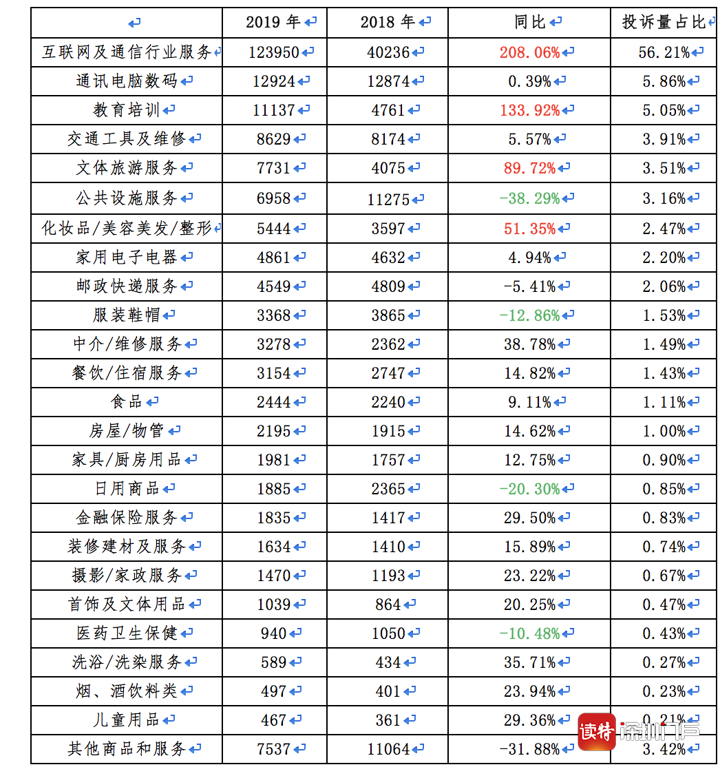 原標(biāo)題:2019年全年消費(fèi)投訴超22萬宗 互聯(lián)網(wǎng)及通信行業(yè)服務(wù)投訴量增幅超2倍