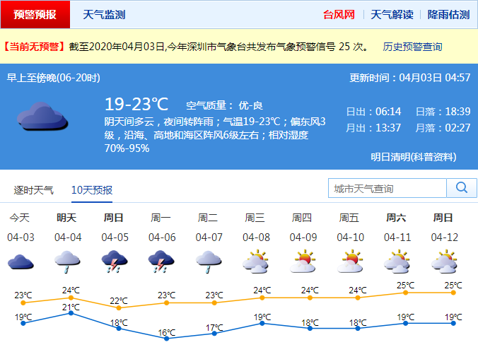 見圳客戶端·深圳新聞網(wǎng)2020年4月3日訊 深圳今日陰天間多云,夜間轉(zhuǎn)陣雨;氣溫21-23℃;偏東風(fēng)3級,沿海、高地和海區(qū)陣風(fēng)6級左右;相對濕度70%-95%。清明假期4-6日有一次明顯降雨過程,并伴有雷暴,氣溫下降,其中4日有(雷)陣雨,5-6日有中到大雨局部暴雨;7日降雨減弱,轉(zhuǎn)多云。