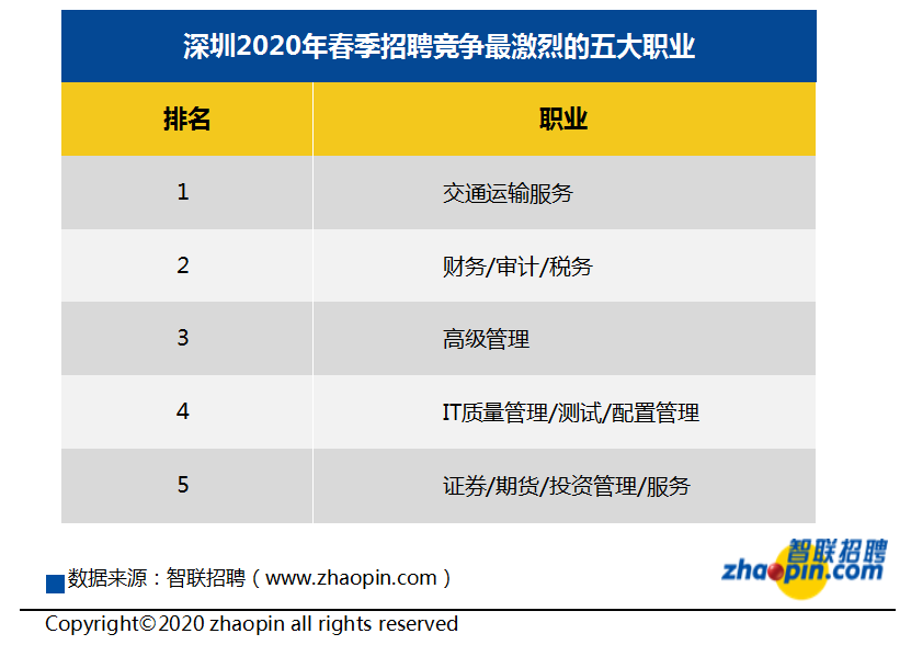 智聯(lián)招聘在線數(shù)據(jù)顯示,深圳地區(qū)2020年春季競(jìng)爭(zhēng)最激烈的職業(yè)是交通運(yùn)輸服務(wù)、財(cái)務(wù)/審計(jì)/稅務(wù)和高級(jí)管理。此外,IT質(zhì)量管理/測(cè)試/配置管理和證券/期貨/投資管理/服務(wù)的競(jìng)爭(zhēng)也較為激烈。交通運(yùn)輸服務(wù)競(jìng)爭(zhēng)指數(shù)環(huán)比、同比上升,本季度排名上升兩位至榜首;財(cái)務(wù)/審計(jì)/稅務(wù)競(jìng)爭(zhēng)指數(shù)環(huán)比、同比上升,排名沒有變化;高級(jí)管理競(jìng)爭(zhēng)指數(shù)環(huán)比上升、同比下降,排名上升一位;IT質(zhì)量管理/測(cè)試/配置管理競(jìng)爭(zhēng)指數(shù)環(huán)比、同比下降,排名下降三位;證券/期貨/投資管理/服務(wù)競(jìng)爭(zhēng)指數(shù)環(huán)比上升、同比下降,排名由上季度第九上升至本季度第五。