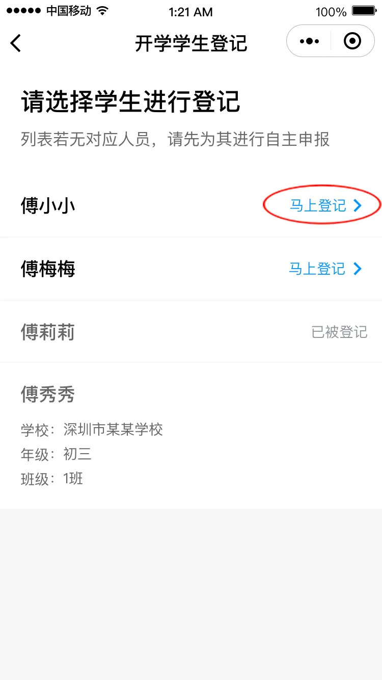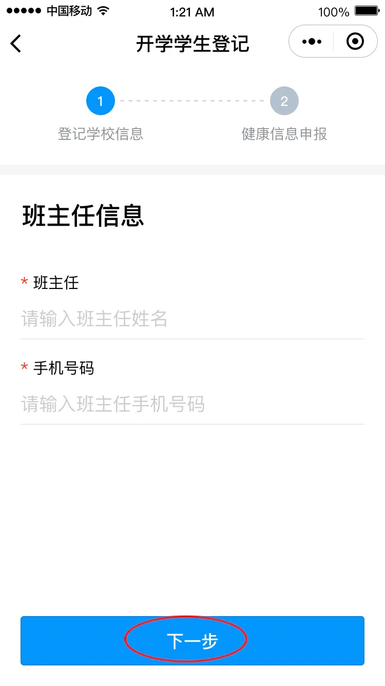進(jìn)入“開(kāi)學(xué)學(xué)生登記”頁(yè)面,點(diǎn)擊“馬上登記”進(jìn)入登記界面,填寫(xiě)班主任姓名和手機(jī)號(hào)碼后點(diǎn)擊“下一步”,請(qǐng)選擇對(duì)應(yīng)的班級(jí),進(jìn)入健康申報(bào)卡界面。