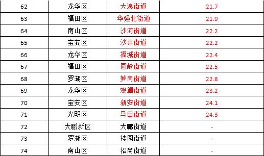 空氣質(zhì)量排名前十的街道是:桃源街道、黃貝街道、南灣街道、南湖街道、東湖街道、蓮塘街道、蛇口街道、福保街道、海山街道和東曉街道;空氣質(zhì)量排名倒數(shù)十位的街道是:馬田街道、新安街道、觀瀾街道、筍崗街道、園嶺街道、福城街道、沙井街道、沙河街道、華強北街道和大浪街道。