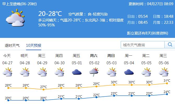 見圳客戶端?深圳新聞網(wǎng)2020年4月27日訊 27日我市多云間晴天,部分時(shí)間有輕微-輕度灰霾;氣溫20-28℃;東北風(fēng)2-3級(jí);相對(duì)濕度50%-95%。未來(lái)幾天陽(yáng)光增多,氣溫回升,溫暖干燥;5月1-3日多云間陰天,早晚有輕霧,間中有分散陣雨。