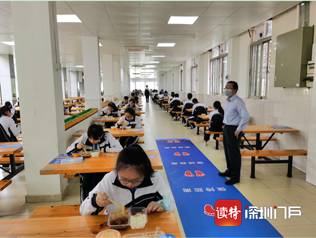 午餐期間,翠園初級中學(xué)在食堂的每張桌上貼有學(xué)生班級和姓名,一桌一人。就餐期間,學(xué)生有序就座。