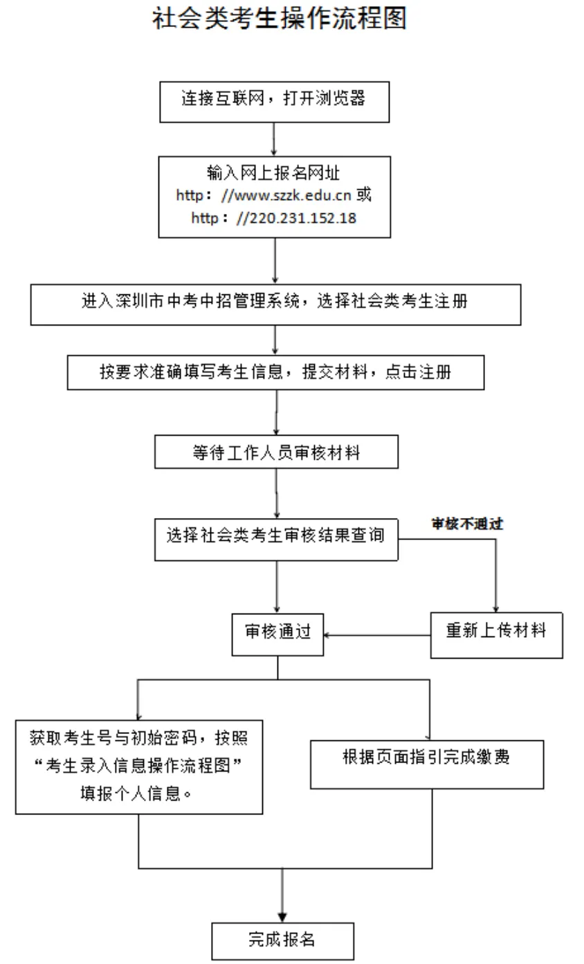見圳客戶端·深圳新聞網(wǎng)2020年4月30日訊 據(jù)深圳市教育局消息,2020年深圳高中階段學(xué)校招生考試(以下簡稱“中考”)報(bào)名定于5月6日-15日進(jìn)行,考試時(shí)間為7月20日-21日。 今年本市應(yīng)屆初中畢業(yè)生仍繼續(xù)在就讀學(xué)校集體辦理報(bào)名手續(xù)。符合深圳中考報(bào)名條件的深圳戶籍往屆生、在市外就讀的深圳戶籍應(yīng)屆初中畢業(yè)生(以下簡稱“社會(huì)類考生”)采用網(wǎng)上報(bào)名方式進(jìn)行報(bào)名。 報(bào)名條件 一、具有我市戶籍的初中畢業(yè)生,可以在我市報(bào)名參加中考。 二、具有我市初三學(xué)籍的隨遷子女可以報(bào)名參加中考,同時(shí)符合以下條件的,可以參加相應(yīng)的公辦普高、民辦普高和中職學(xué)校的劃線錄取。 (一)父親或母親在我市具有合法穩(wěn)定職業(yè); (二)父親或母親在我市具有合法穩(wěn)定住所; (三)父親或母親持有有效《深圳經(jīng)濟(jì)特區(qū)居住證》; (四)父親或母親在我市繳納基本養(yǎng)老保險(xiǎn)及基本醫(yī)療保險(xiǎn),且至少其中一個(gè)險(xiǎn)種累計(jì)繳費(fèi)滿3年,社保累計(jì)年限計(jì)算截至2020年8月31日; (五)隨遷子女在我市具有3年完整初中學(xué)籍。 不符合上述條件但具有我市初中學(xué)籍的隨遷子女,可以在我市參加中考,但僅限于參加民辦普高補(bǔ)錄或中職學(xué)校注冊入學(xué)。 三、高中階段學(xué)校在校生不得報(bào)名。 本市應(yīng)屆初中畢業(yè)生報(bào)名辦法 本市應(yīng)屆初中畢業(yè)生于5月6日至7日在就讀學(xué)校集體辦理報(bào)名手續(xù)。 今年中考繼續(xù)實(shí)行網(wǎng)上報(bào)名。要求各學(xué)校開放計(jì)算機(jī)房,為本校考生上網(wǎng)報(bào)名提供方便。 5月8日至15日,學(xué)校組織考生進(jìn)行電子攝像,學(xué)校和考生分別上網(wǎng)錄入報(bào)名信息,考生錄入信息可參考“考生錄入信息流程圖”進(jìn)行操作。 市教育局強(qiáng)調(diào),學(xué)校不得以任何理由拒絕有本校學(xué)籍的應(yīng)屆畢業(yè)生報(bào)考(參加中職學(xué)校自主招生、注冊入學(xué)的考生,也須報(bào)名參加中考)。如有違反者,將嚴(yán)肅查處,并追究相關(guān)人員責(zé)任。同時(shí)要求各區(qū)有關(guān)職能部門、各有關(guān)學(xué)校(報(bào)名點(diǎn))要嚴(yán)格審查報(bào)名材料。對不符合報(bào)名條件、弄虛作假而被錄取的考生,一經(jīng)發(fā)現(xiàn),取消其錄取資格;已經(jīng)到錄取學(xué)校報(bào)到注冊的,取消其學(xué)籍,并追究相關(guān)人員責(zé)任。 社會(huì)類考生報(bào)名辦法 社會(huì)類考生采用網(wǎng)上報(bào)名方式進(jìn)行報(bào)名。報(bào)名考生需在5月6日至15日登錄報(bào)名網(wǎng)址(http://www.szzk.edu.cn/),按照提示進(jìn)行網(wǎng)上注冊,上傳報(bào)名審核資料,由考生戶籍所在區(qū)社會(huì)報(bào)名點(diǎn)進(jìn)行線上審核,審核通過后系統(tǒng)將生成中考考生號及初始密碼,考生需用獲取的考號及密碼登錄中考中招管理系統(tǒng),填寫個(gè)人信息,具體操作可參考“考生錄入信息流程圖”。同時(shí)需在報(bào)名截止前根據(jù)指引完成網(wǎng)上繳費(fèi)。 若考生網(wǎng)上報(bào)名審核不通過,需按照系統(tǒng)的不通過原因提示,重新補(bǔ)充審核資料,如多次上傳資料失敗或?qū)徍瞬煌ㄟ^,考生可撥打戶籍所在區(qū)的社會(huì)報(bào)名點(diǎn)電話進(jìn)行咨詢或電話預(yù)約,按照工作人員指示進(jìn)行操作報(bào)名,不要在未預(yù)約的情況下前往社會(huì)報(bào)名點(diǎn),盡量避免出行,減少人員聚集。 社會(huì)類考生操作流程如下圖: