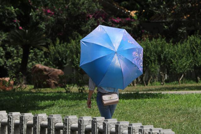 ▲遮陽(yáng)傘、太陽(yáng)帽成了市民出行必備之物。