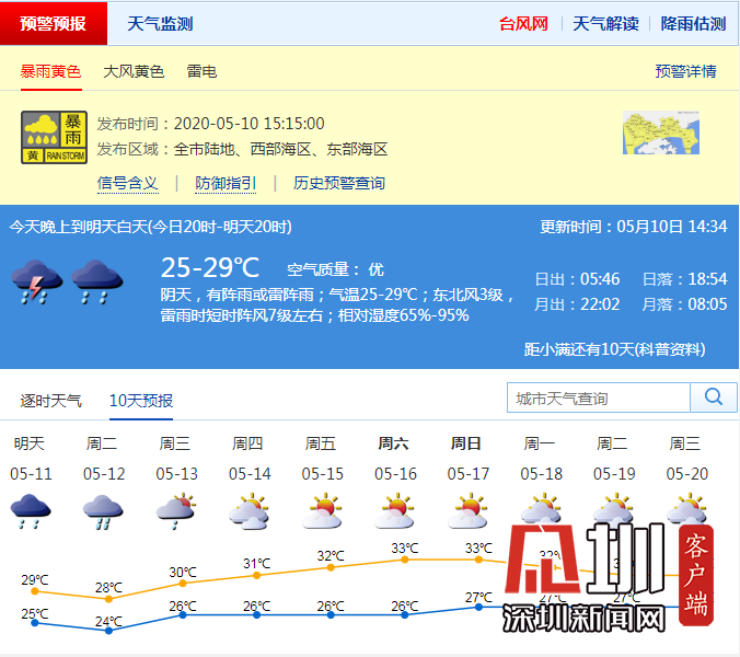 全市進(jìn)入暴雨戒備狀態(tài),請注意防御大風(fēng)和短時(shí)強(qiáng)降水及其引發(fā)的城市積澇、隧道涵洞匯流等。此前,深圳市氣象臺(tái)于2020年05月10日15時(shí)00分在全市發(fā)布雷電預(yù)警,預(yù)計(jì)60分鐘內(nèi)全市自西北向東南將受雷電影響。
