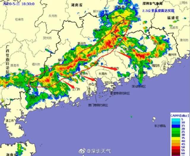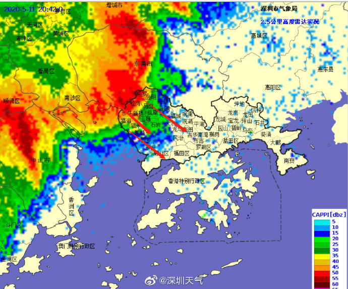 20時56分:目前強雷雨云團已開始影響寶安北部,未來一小時強雷雨自西向東影響寶安、光明、龍華、南山、福田、羅湖區(qū),上述區(qū)域最大小時雨量30-40毫米,請大家注意做好防御。