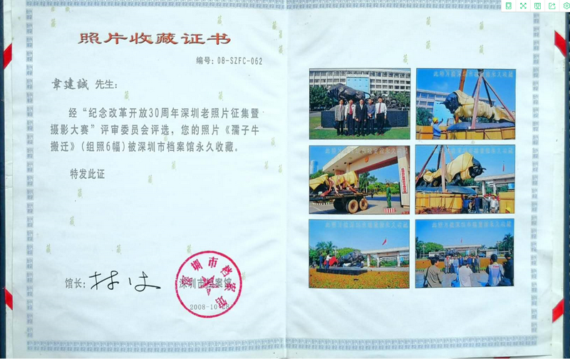 “一開始,我提出這個遷移建議時,還是有點忐忑的,后來得知‘孺子?!袼軐⒁浦潦形笤和夂?,我非常高興,這樣一來,跟‘孺子?!嫌熬头奖愣嗔搜?!”“孺子牛”雕塑遷移當天,韋建誠興奮地拿起相機,用鏡頭定格下整個搬遷過程。“那一天是我人生最難忘的日子之一,既是我44歲生日,又是‘孺子?!袼馨残录抑?。”回憶起當時的情況,韋建誠還是十分興奮。而韋建誠拍攝的組照后來被深圳市檔案館永久收藏。深圳市委辦公廳還將《市民希望將“孺子?!钡袼芤浦潦懈笤和狻吩u為一等獎。